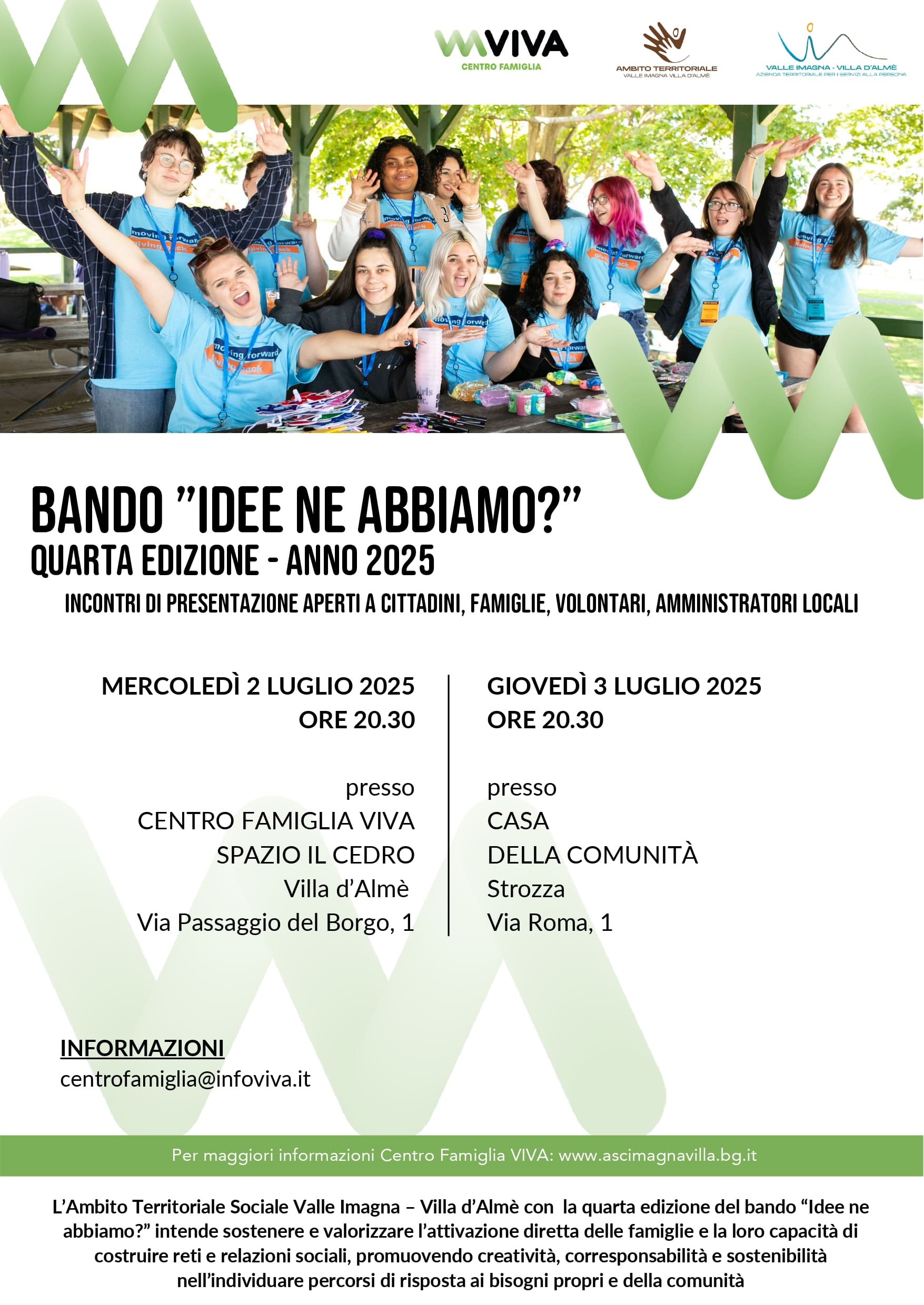 Tenuto conto del successo delle tre edizioni precedenti (la prima delle quali promossa all’interno del progetto “Distanze Ravvicinate” con il concorso di Fondazione Cariplo) l’Ambito Territoriale Sociale Valle Imagna – Villa d’Almè con la quarta edizione del bando “Idee ne abbiamo?” intende sostenere e valorizzare l’attivazione diretta delle famiglie e la loro capacità di costruire reti e relazioni sociali, promuovendo creatività, corresponsabilità e sostenibilità nell’individuare percorsi di risposta ai bisogni propri e della comunità.
